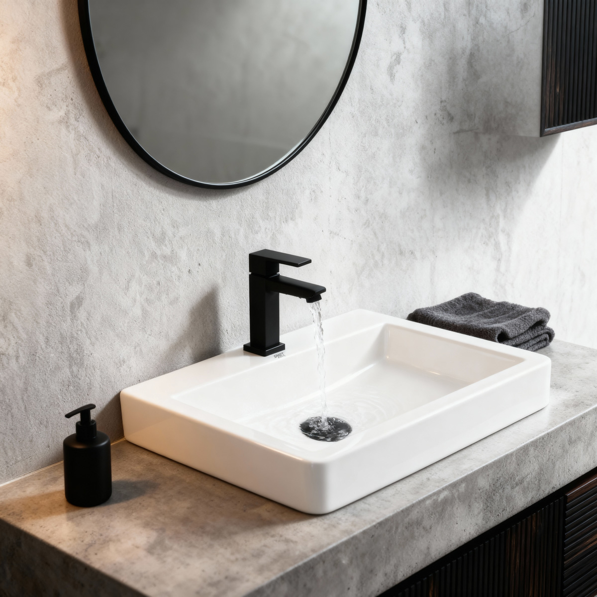Conheça o nosso novo kit completo para banheiro, que inclui uma cuba de cerâmica legítima com acabamento esmaltado, uma torneira preto fosca de bica alta e uma válvula preto fosco, para um visual moderno e sofisticado.
