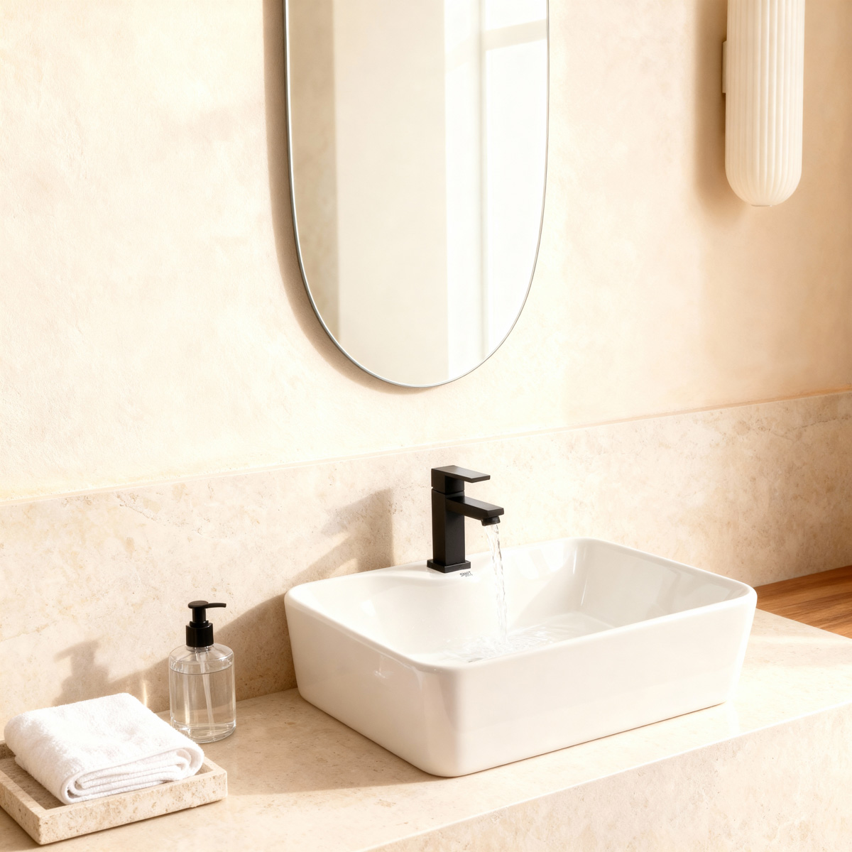 Conheça o nosso novo kit completo para banheiro, que inclui uma cuba de cerâmica legítima com acabamento esmaltado, uma torneira preto fosca de bica alta e uma válvula preto fosco, para um visual moderno e sofisticado.
